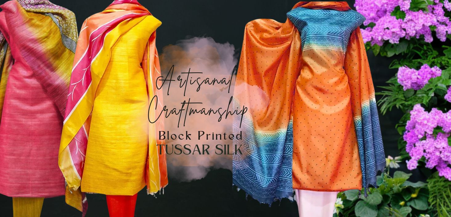 Discover our exquisite collection of hand block-printed Tussar silk suits and dress...