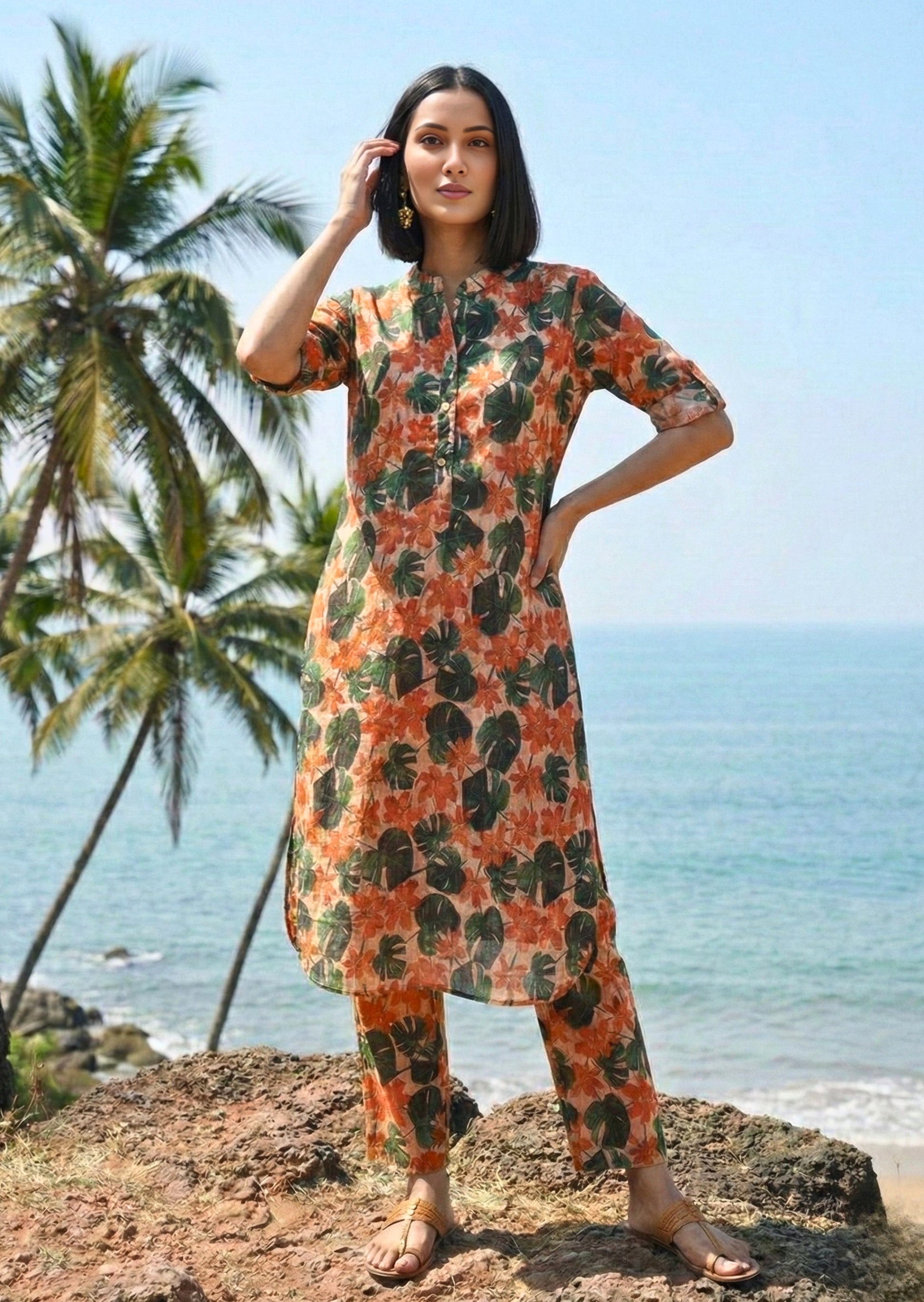 Printed Cotton Co-ord Set Leaf Prints s a A refined mandarin collar leading into a clean button-down placket. Features functional roll-up sleeves with button tabs for a versatile look.